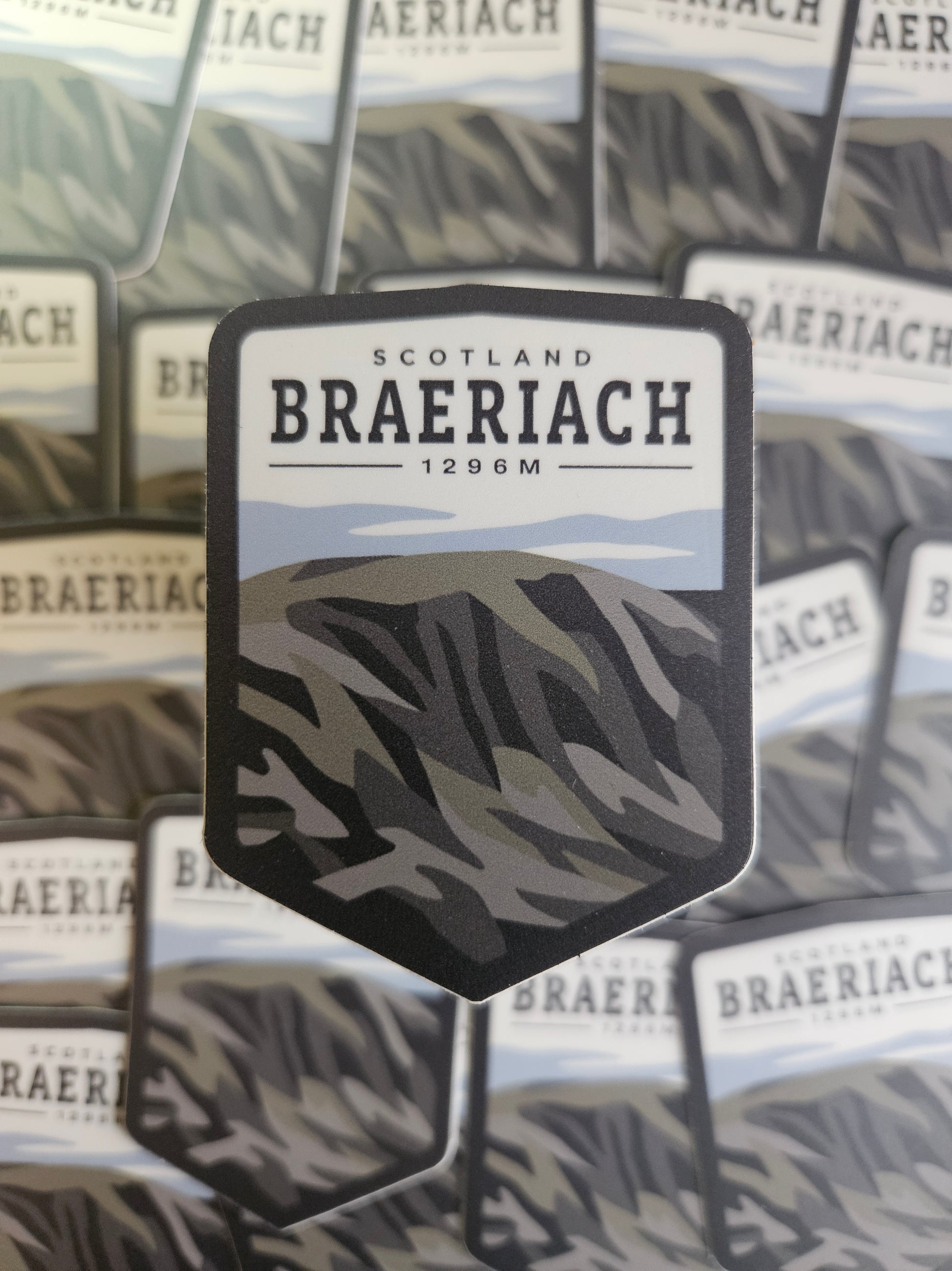 Braeriach sticker to celebrate climbing the third-highest mountain in the UK. Known in Gaelic as Am Bràigh Riabhach (“the brindled upland”), it rises to 1,296 metres (4,252 ft) in the heart of the Cairngorms.