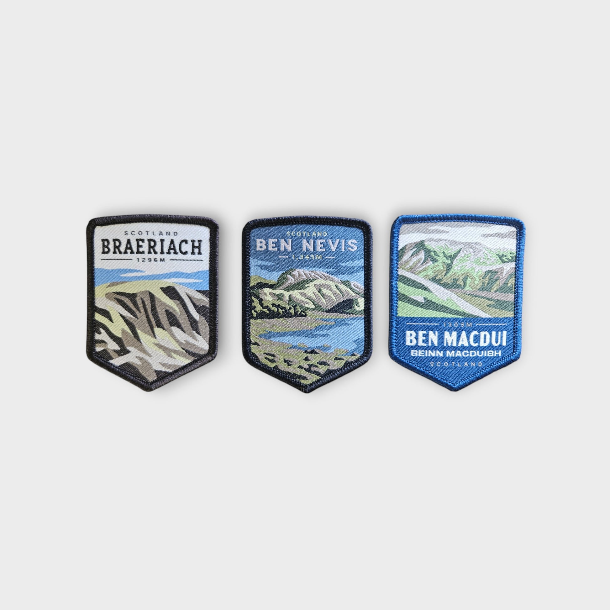 Scottish Three Peaks iron-on patch set to celebrate completing this tough mountain challenge, taking on Ben Nevis (1,345 m), Ben Macdui (1,309 m), and Braeriach (1,296 m). The three highest peaks in Scotland.